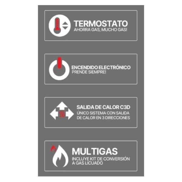 - Potente calefacción de 5000 Kcal/h para espacios cálidos y acogedores