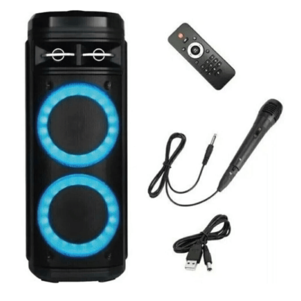 Parlante bluetooth portátil doble 6″» Doble parlante 6″» Luces Led. Entradas: USB/ Tarjeta SD/ Auxiliar/ entrada para micrófono.